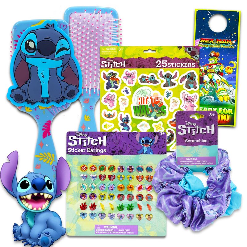 Lilo and Stitch Hair Accessories Set - Bundle with Stitch Hair Scrunchies, Sticker Earrings, Hair Brush, Tattoos, and More | Stitch Accessories for Girls. This Lilo and Stitch accessories set contains 4 hair scrunchies, 24 pairs of sticker earrings, and 1 hair brush (colors may vary), each featuring colorful artwork of Stitch in fun different designs. Styles may vary. Great for all fans of Lilo and Stitch, this hair accessories set is great to use as party favors, goodie bag fillers, stocking stuffers, part of a gift basket, and more. Sure to be a hit with Lilo and Stitch fans of all ages, these Stitch hair and dress up accessories will make a great addition to any dress up parties and the assorted styles will allow for endless combinations of fun looks! Officially licensed Disney Lilo and Stitch accessories for toddlers also includes bonus Stitch temporary tattoos and a Rex-Man door hanger.
