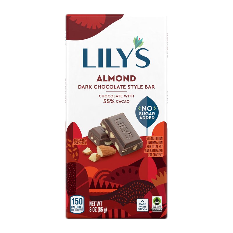 - Contains twelve (12) 12-count boxes of 3-ounce LILY'S Almond Dark Chocolate Style No Sugar Added Sweets Bars in a bulk case