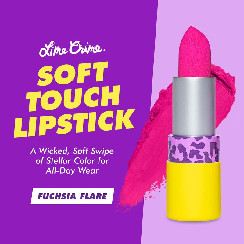 - Fuchsia Flare Soft Touch Lipstick: Look no further, Lime Crime’s Soft Touch Lipstick is the smoothest, most comfortable and wearable matte lipstick you’ll ever try on. Fuchsia Flare delivers a cloud of bright fuchsia to the lips, effortlessly gliding on to smooth out lip lines with a lip blurring effect.