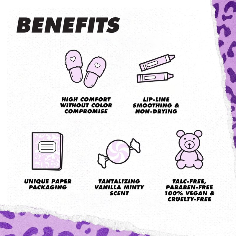 - Benefits: This buttery soft formula is free of harmful talc and parabens. Lime Crime is certified by both Leaping Bunny and PETA, and we design, manufacture, and assemble quality products using globally sourced ingredients for high performance wear and strong color pay-off.