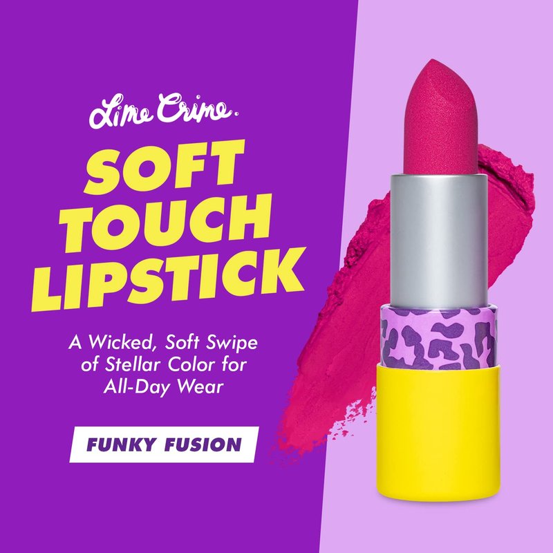 - Funky Fusion Soft Touch Lipstick: Look no further, Lime Crime’s Soft Touch Lipstick is the smoothest, most comfortable and wearable matte lipstick you’ll ever try on. Funky Fusion delivers a cloud of bright berry to the lips, effortlessly gliding on to smooth out lip lines with a lip blurring effect.