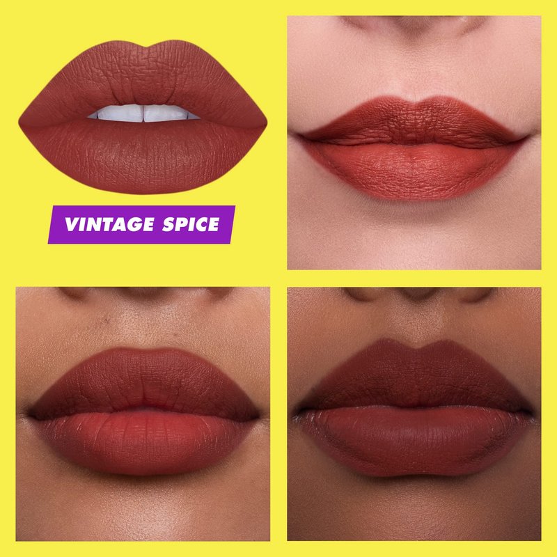 - Vintage Spice Soft Touch Lipstick: Look no further, Lime Crime’s Soft Touch Lipstick is the smoothest, most comfortable and wearable matte lipstick you’ll ever try on. Vintage Spice delivers a cloud of terracotta reddish brown to the lips, effortlessly gliding on to smooth out lip lines with a lip blurring effect.