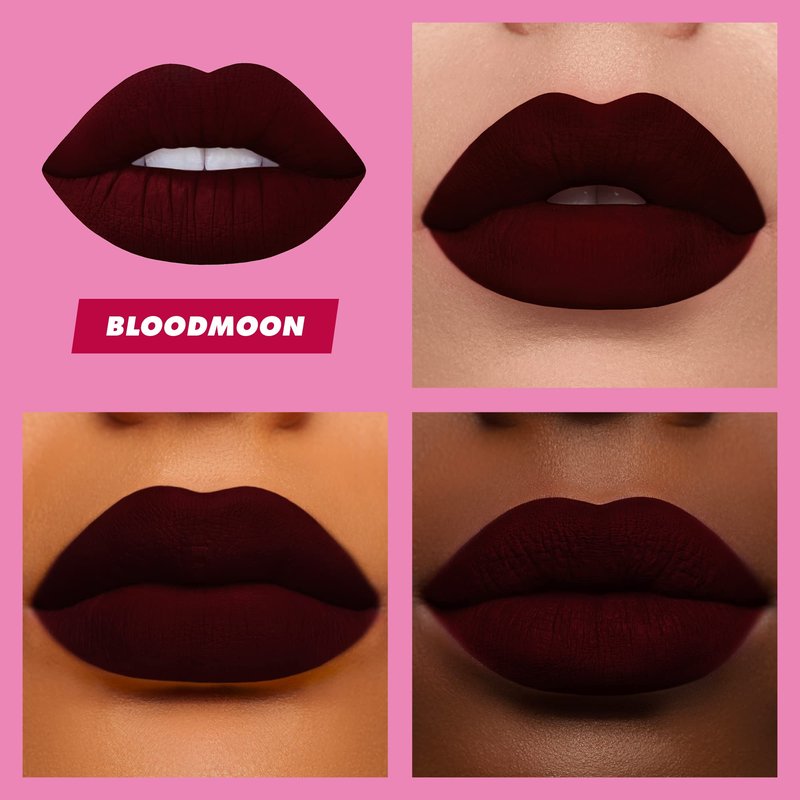 - Bloodmoon Velvetines Liquid Matte Lipstick: Inspired by our founder’s favorite flower, a red rose, the formula in Lime Crimes Velvetines Liquid Lipsticks easily glides on your lips and dries down to a soft matte finish with a creamy velvety texture – like a rose petal. Bloodmoon will bolden your makeup look with a deep blood red pout.