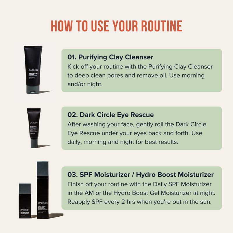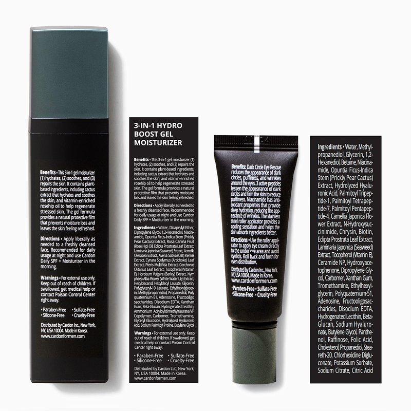 Cardon Anti-Aging Skin Care Set specifically formulated for men. Cardon's korean skincare set has everything you need for an easy and simple skincare routine. This set includes: (1) newly launched Cardon Dark Circle Eye Rescue for dark circles and puffy eyes / eye bags (2) Purifying Clay Cleanser mens face wash to remove dirt and oil and cleanse the pores, (3) Lightweight SPF Moisturizer to hydrate and protect your face from UVA and UVB rays with no white residue (SPF 30). This award-winning Korean moisturizer is a customer favorite! and (4) Hydro Boost Gel Moisturizer to repair your skin overnight and fight wrinkles and irritation. With advanced Korean skincare technology, Cardon brings you the best skincare at an affordable price. This set contains a 60-day supply of products for twice daily use.