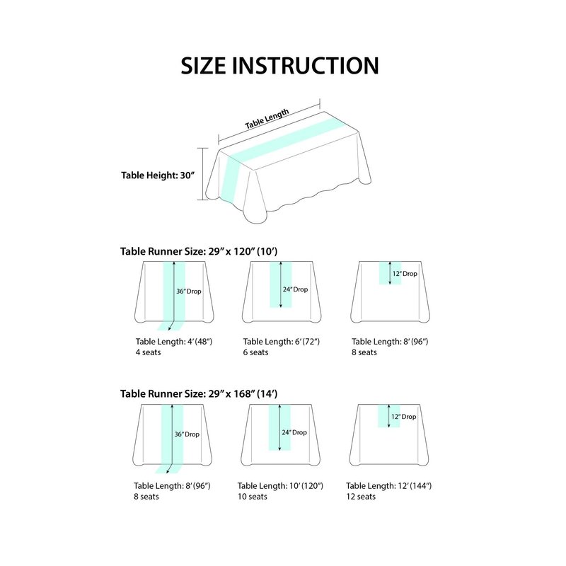 - Reference: If you want to pool this table runner on the ground, we suggest adding at least 6ft to the size of your table. A 10ft table runner can be used on a 3-4ft in diameter round or 3-4ft rectangular table, and a 14ft table runner can be used on a 6-8ft round or rectangular table, which can help present the best decorative effect like the picture.