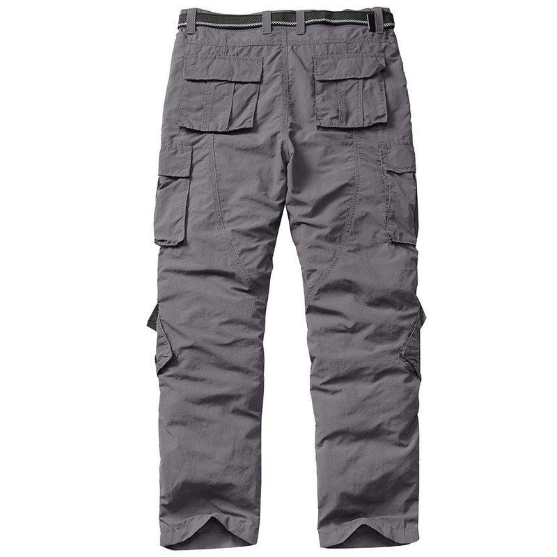 - Fishing/Camping Pants Men: This nylon cargo pants are with side elastic waist for maximum comforts and 8 pockets for your belongings safety - Slant pockets x 2, Rear pockets x 2, Thigh cargo pockets x 2, Leg pockets x2.