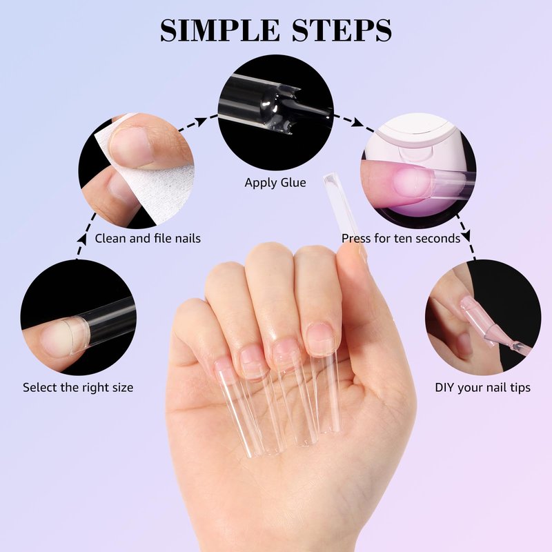 - Long Square Clear Nail Tips: Get the perfect nail shape with our Long Square Nail Tips! Square nail tips bring a chic and trendy look and perfect length. The long nail tips give you more room for creativity. Apply glue and add colorful decorations, you will catch everyone's attention in every occasions with square nail tips, flaunt your unique nails charm.