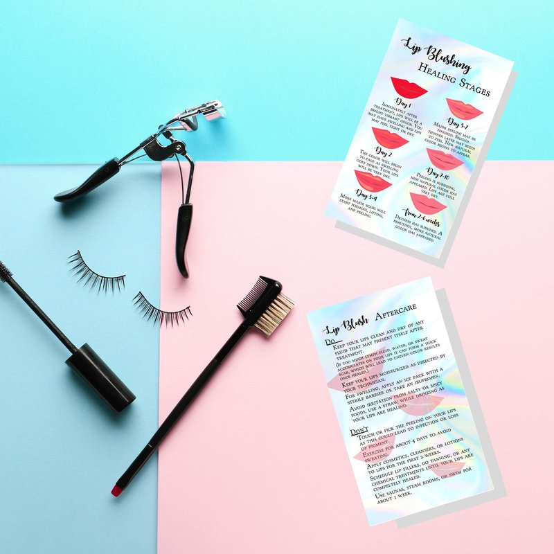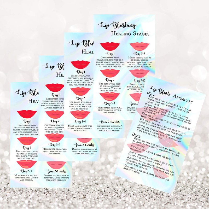 Lip Blush Stages of Healing & Aftercare Instructions Card | 50 Pack | 2x3.5" inches Business Card Size | Lip Blush Lip Glow Lip Tint PMU Lip Liner Full Lip Tint Tattoo | Holographic Look Design