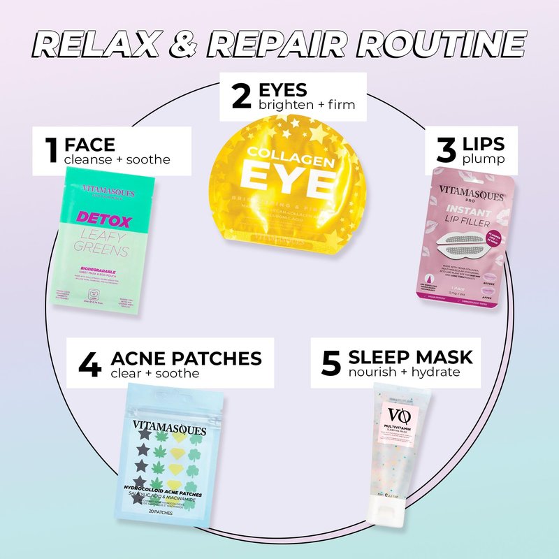 - Repair and Revitalize: The lip masks plump and smooth using multi-molecular hyaluronic acid and a vegan collagen booster for a natural refresh. The same key ingredients firm the delicate under-eye area and brighten the appearance of eyes in the vegan collagen eye pads.
