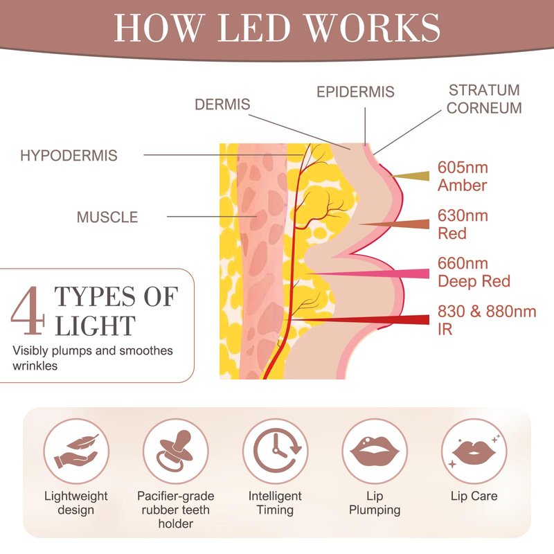 - ๐๐For lip plumping and eye anti-aging: The lip plumper device red light therapy consists of 8 non-heat generating LED bulbs that produce a red light that penetrates deep into the skin, boosting blood circulation to the lips, supporting healthy collagen, and improving lip color and texture.