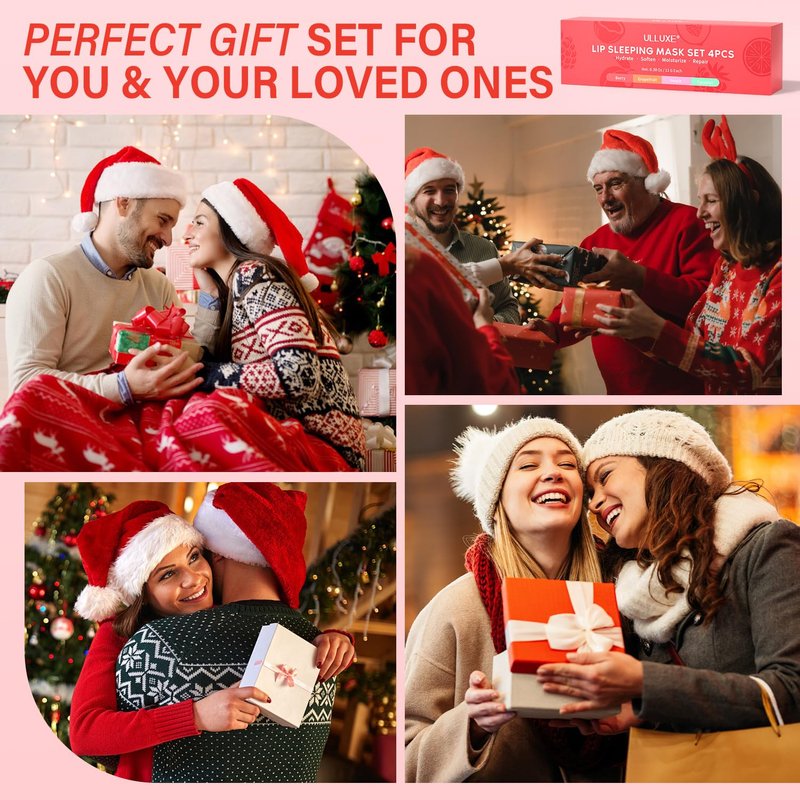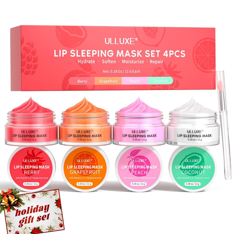 Ulluxe Lip Sleeping Mask 4-Piece Set with four Scent- Berry Lip Mask, Grapefruit Lip Mask, Peach Lip Mask, and Coconut Lip Mask.