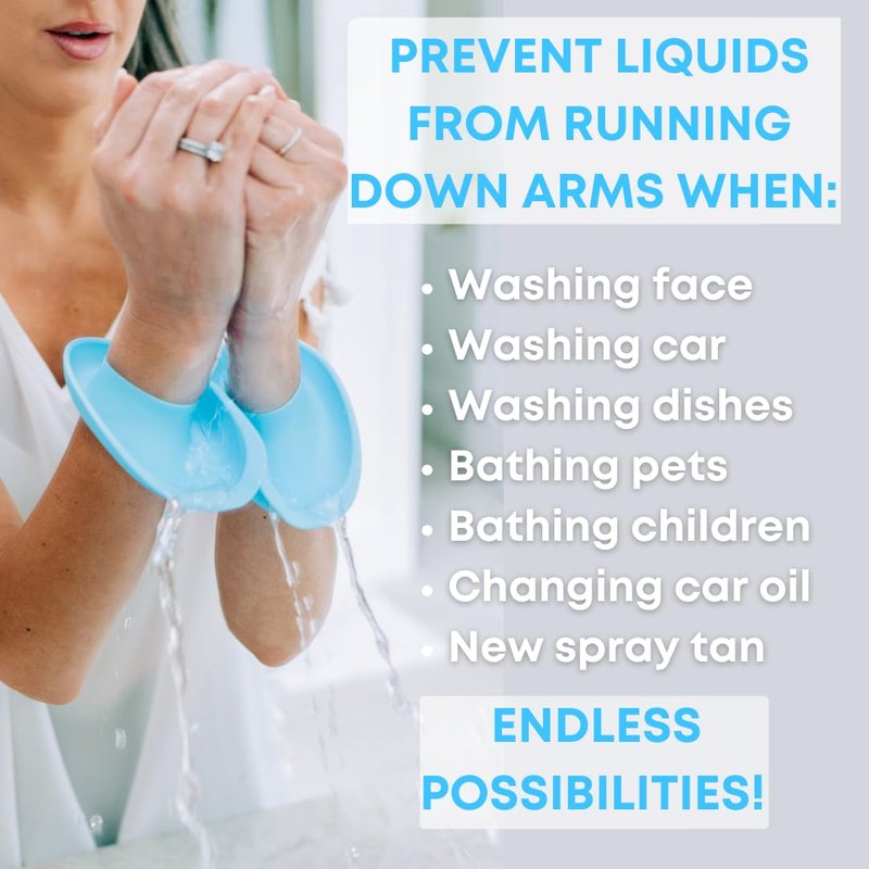 Our patent pending LiquiBands are functional wristbands with a water-tight seal used to capture liquid, prevent it from running down your arms, and divert it away for a clean, dry, washing experience. Whether you are washing your face, the dishes, the dog or the car, these will ensure you stay mess-free! Unlike cloth wrist bands, these dry instantly, will not stain and will not smell. The bracelets are lightweight, comfortable and flexible ensuring they will fit any wrist size and glide on smoothly. Our high-quality silicone is hypoallergenic, recylcable and dishwasher-safe making it a long-lasting, quick-drying, sustainable solution keeping you and your world mess free.