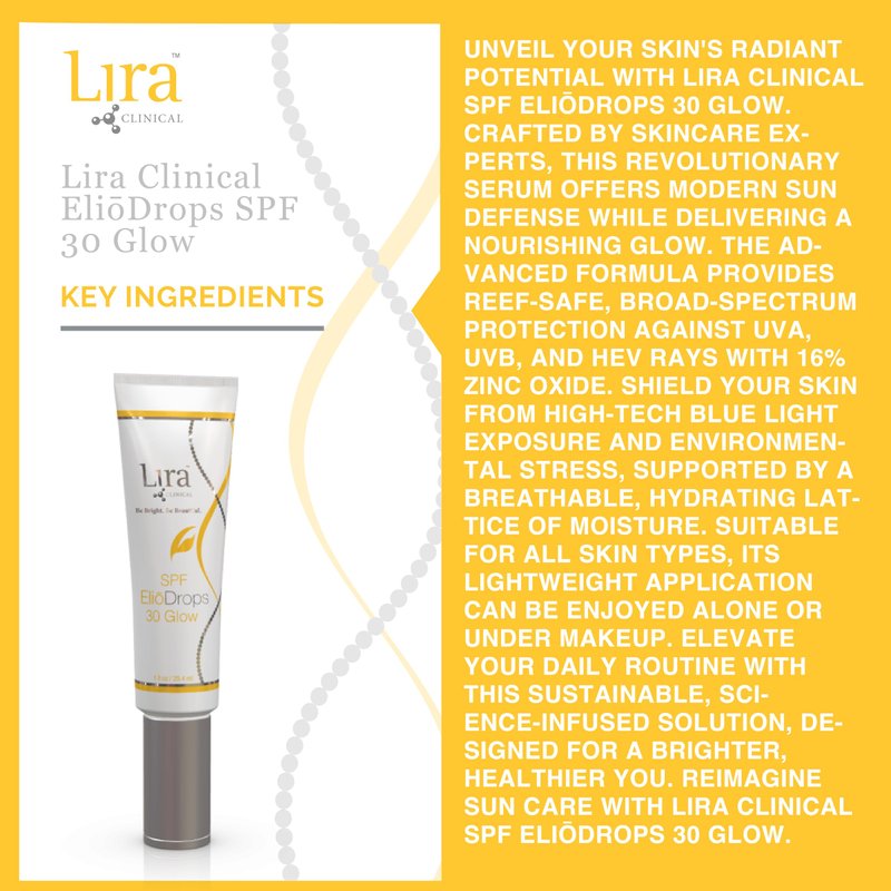 "Unveil your skin's radiant potential with Lira Clinical SPF EliōDrops 30 Glow. Crafted by skincare experts, this revolutionary serum offers modern sun defense while delivering a nourishing glow. The advanced formula provides reef-safe, broad-spectrum protection against UVA, UVB, and HEV rays with 16% zinc oxide. Shield your skin from high-tech blue light exposure and environmental stress, supported by a breathable, hydrating lattice of moisture. Suitable for all skin types, its lightweight application can be enjoyed alone or under makeup. Elevate your daily routine with this sustainable, science-infused solution, designed for a brighter, healthier you. Reimagine sun care with Lira Clinical SPF EliōDrops 30 Glow."