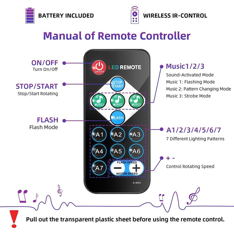 - 【Remote Controlled DJ LIGHTS】Comes with a remote controller, you can use it to turn on/off the lights, change sound activated/lighting modes and control the rotating/flash speed. All functions on the remote, very easy to use.