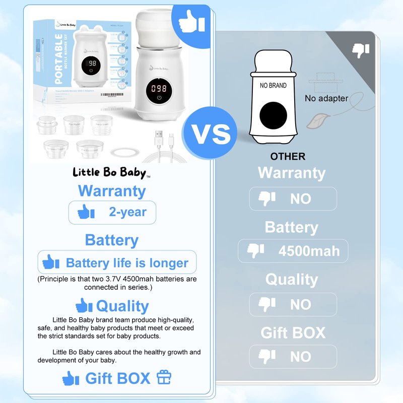 - 🍼Bottle warmer fit for most bottles: The Little Bo Babay brand adapter series fits most major bottle brands including Dr Brown’s, Medela, NUK, Playtex, Tommee Tippee, Comotomo and so on. For compatibility with baby bottle.