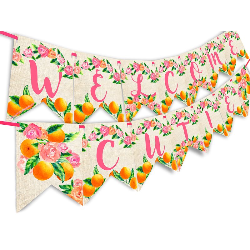 - 15 paper pennant flags which spell Welcome Cutie as well as 2 end pieces featuring Gorgeous Hand Painted Cutie Oranges and Flowers
