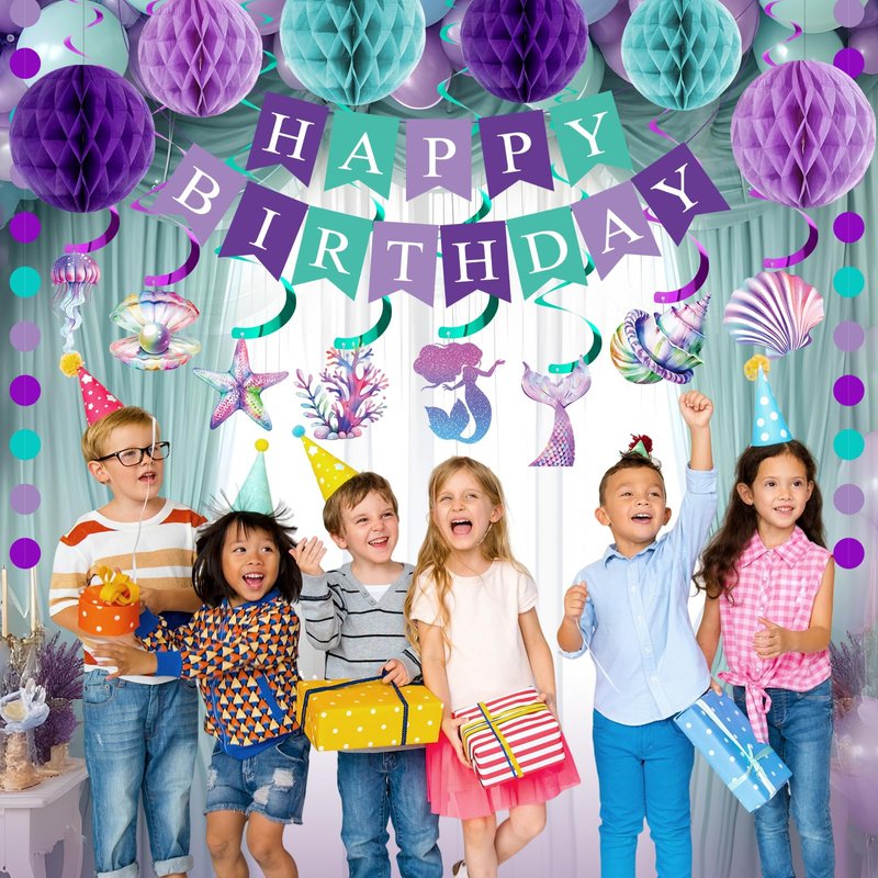 - Package Included: This treasure trove includes 1 Little Mermaid Happy Birthday banner sign 8 pcs Hanging Swirl accented with purple hues and iconic sea-themed elements, 6 pcs Lavish purple honeycomb balls, 1 circle dot garland in coordinating ocean colors. Each piece combines to form an alluring mermaid realm for a memorable first birthday or summer soiree.