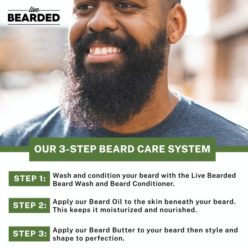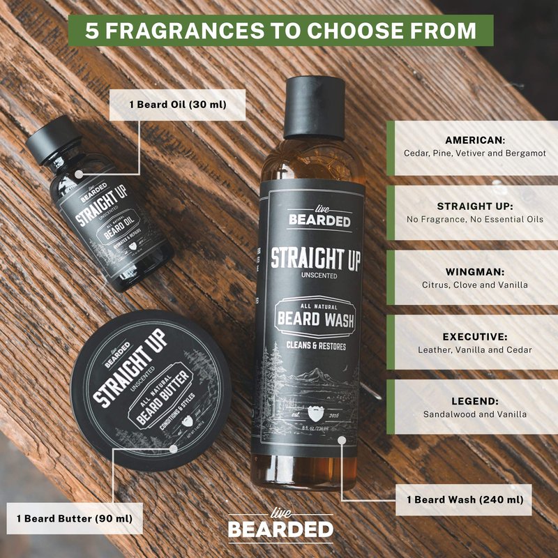Live Bearded: 3-Step Beard Grooming Kit - Straight Up - Beard Wash, Beard Oil and Beard Butter - All-Natural Ingredients with Shea Butter, Jojoba Oil and More - Beard Growth Support - Made in the USA