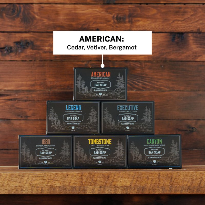 - AMERICAN: We couldn’t mix any bald eagle tears into this soap, but we figured cedar, vetiver, and bergamot were close enough. With their powers combined, you get an exfoliating bar soap that smells like freedom.