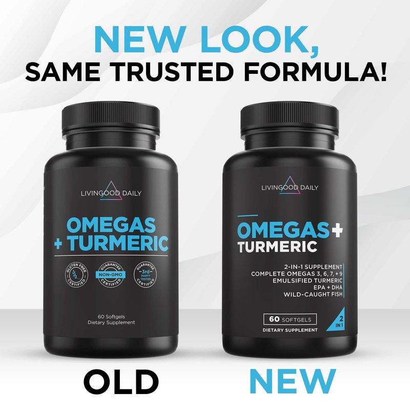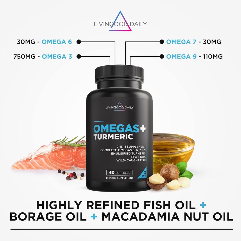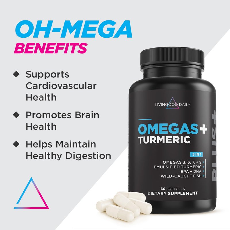 - The Complete Omega Spread: Livingood Daily Omegas + Turmeric is a combination of omegas 3, 6, 7, and 9 that’s formulated to enhance high bioavailability of proprietary quality emulsified turmeric. Our daily supplement helps support cardiovascular health, brain health, healthy digestive functions, joint support, and supports optimal discomfort levels. 60 softgel capsules.
