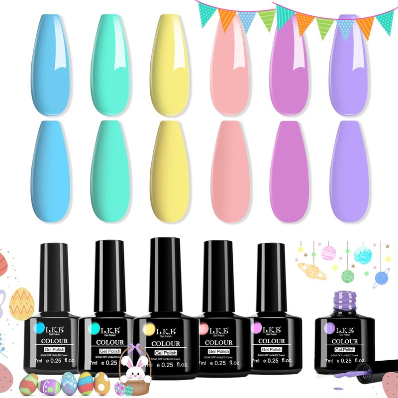 LKE Pastel Gel Nail Polish Kit Spring Easter Gel Polish Set 6 Color Red Pink Purple Blue Green Bright Yellow Gel Polish Soak Off U V Led Gel Nail Art Manicure Kit for Girls Women