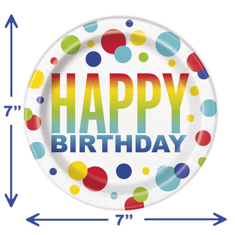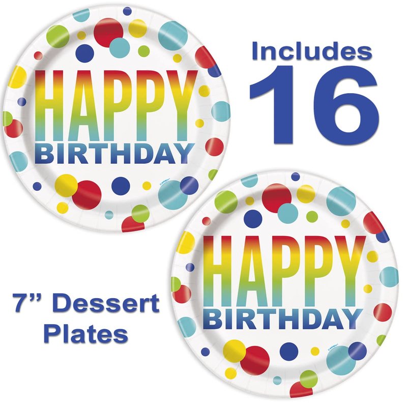 - 16 DESSERT CAKE PLATES - Plates are approx.7" in diameter. Folded around the outer edge to give it additional strength. Your kids are sure to jump for joy when you serve them on these brightly colored birthday paper plates.