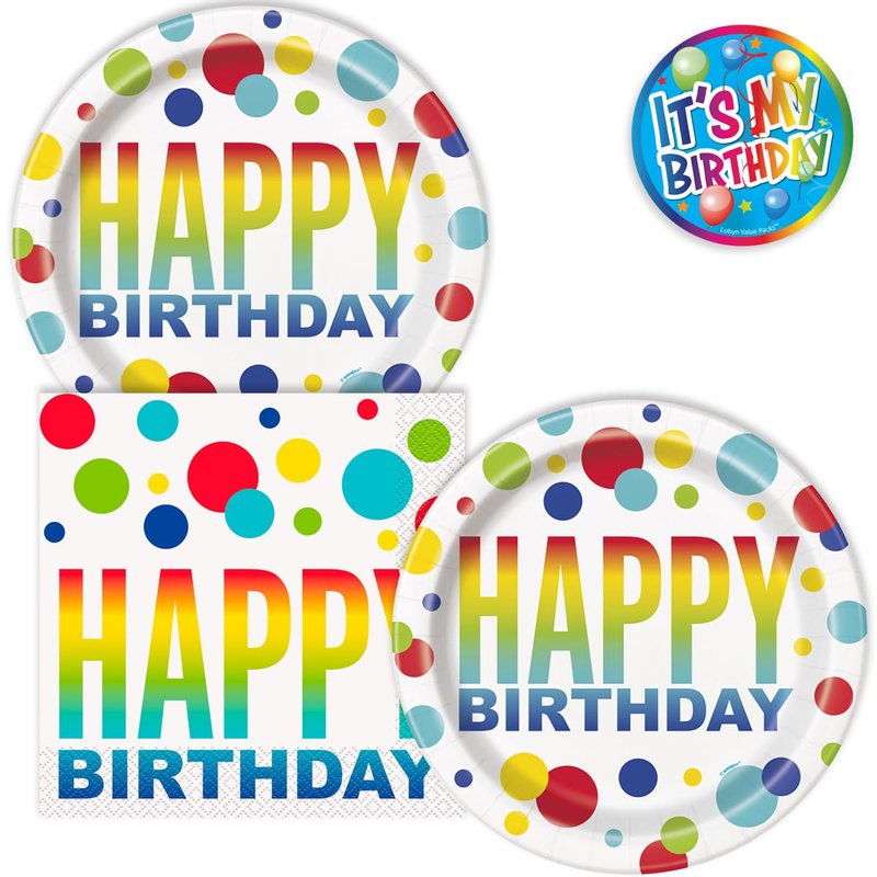 - VIBRANT AND COLORFUL - These decorative and colorful birthday party plates and napkins will add a splash of color to any celebration. These happy birthday plates and napkins feature a very bright pattern to bring smiles and happiness to your special someone.