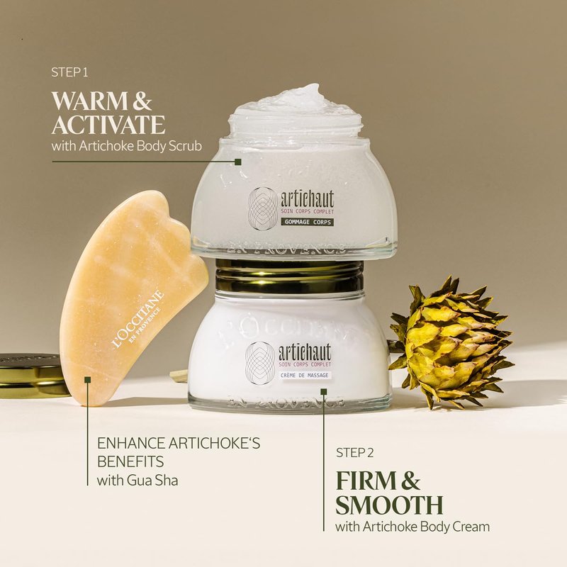 - Routine includes Artichoke Body Scrub + Artichoke Body Cream + Gua Sha