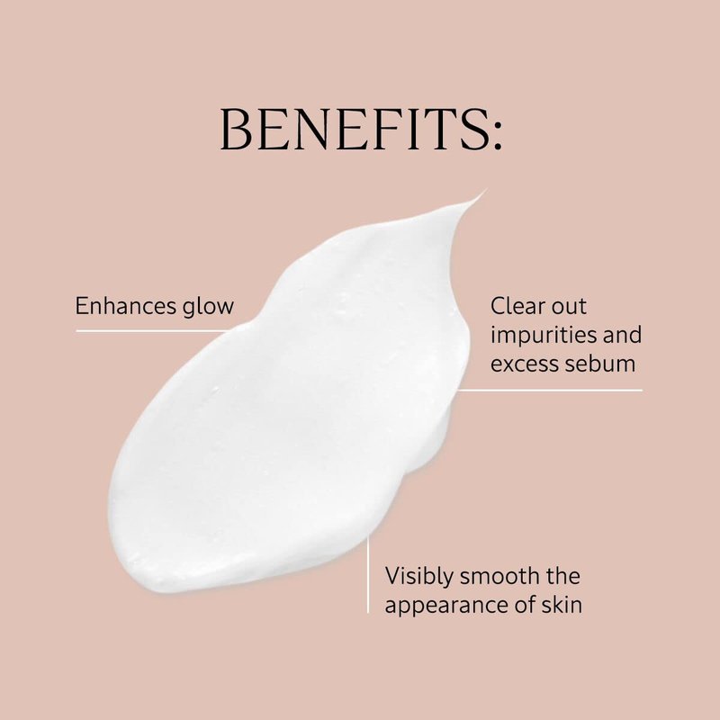 - Cleanses impurities Enhances glow Visibly smooths appearance of skin texture