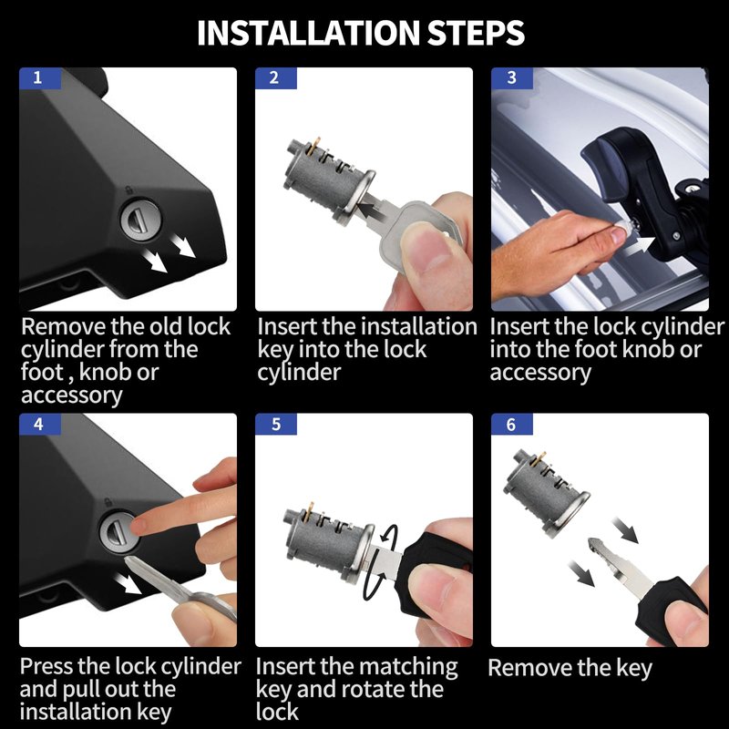 - š”ćEasy to InstallćInsert the master key into the lock core, then push the lock core into the cylinder, press and hold the lock core to pull out the master key, and then insert the matching key to turn and lock. Please refer to reverse order for disassembly