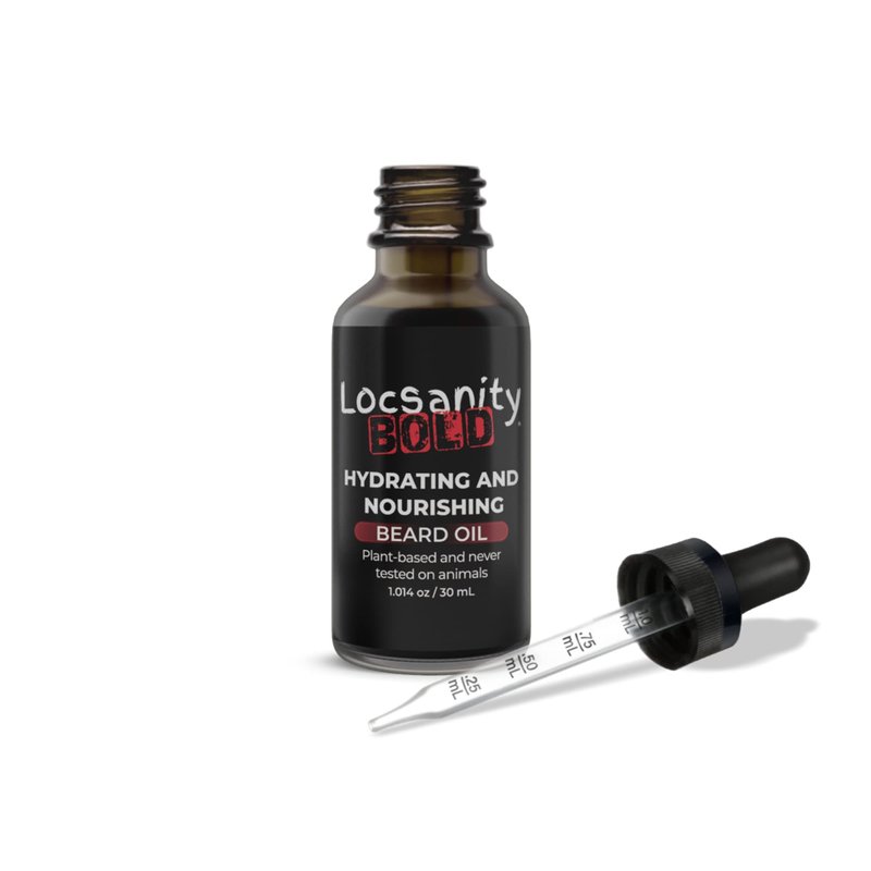 Your beard is your pride and joy! Hydrate and nourish every strand with our premium blend of essential oils. Jojoba Seed Oil and Shea Oil work together to eliminate itchiness and scratchiness. Add sheen and lock in moisture to turn heads and get the attention you deserve. This expertly blended formula not only softens your beard but moisturizes dry skin beneath it. It’s lightweight and non-greasy, conditioning the hair to make it feel soft and smooth. The light fragrances of bergamot, geranium and cedarwood leave your beard smelling great and the company you keep impressed! --------------------------------------------------------------------------------------------------------------------------- Bring sanity to your beard care regimen with our latest innovation in beard care 99% Natural, Plant-Based Ingredients No Parabens No Phthalates No Mineral Oil No Petrolatum --------------------------------------------------------------------------------------------------------------------------- After using our Locsanity BOLD Face and Beard Scrub and drying your beard, apply a few drops of the Locsanity BOLD Beard Oil to your fingertips and massage into the beard from root to ends. For thick, coarse hair, apply more Beard Oil for conditioning. Apply a few drops daily (more for longer beards) onto your palm then work treatment into beard and skin. --------------------------------------------------------------------------------------------------------------------------- Cedarwood - Stimulates hair follicles Sunflower Seed Oil - Hydrates and protects the skin Shea Oil - Powerful moisturizer --------------------------------------------------------------------------------------------------------------------------- Ingredients: Sunflower Seed Oil, Grape Seed Oil, Jojoba Seed Oil, Extra Virgin Olive Oil, Extra Virgin Coconut Oil, Argan Oil, Sweet Almond Oil, Shea Oil, Black Castor Oil, Coco-Caprylate, Vitamin E, Essential Oil Blend (Peppermint and Cedarwood), Fragrance