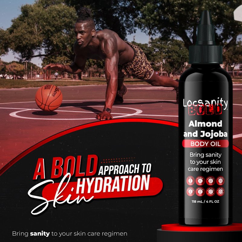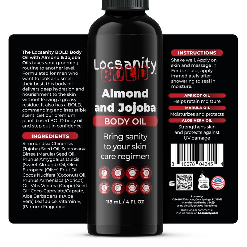 Locsanity BOLD Men's Body Oil is a luxurious blend of nourishing oils that deeply moisturize and rejuvenate the skin. Crafted with a harmonious combination of jojoba seed oil, sweet almond oil, extra virgin olive oil, coconut oil, apricot seed oil, grapeseed oil, marula oil, coco caprylate caprate, and aloe vera oil, this body oil is a true indulgence for your skin. Jojoba seed oil, rich in vitamins and minerals, mimics the skin's natural oils, providing deep hydration without leaving a greasy residue. Sweet almond oil, packed with vitamin E, nourishes and protects the skin, while extra virgin olive oil, helps combat signs of aging. Coconut oil, with its moisturizing properties, soothes and softens the skin. Apricot seed oil, rich in vitamins A and E, promotes skin elasticity and radiance. Grapeseed oil, a lightweight oil, absorbs quickly and imparts a silky smooth feel. Marula oil, a natural emollient, deeply conditions and revitalizes the skin. Coco caprylate caprate, a plant-derived emollient, enhances the absorption of the oils, while aloe vera oil, known for its soothing and healing properties, calms and soothes the skin. This luxurious body oil is a must-have for men seeking a pampering experience and a radiant, healthy glow.