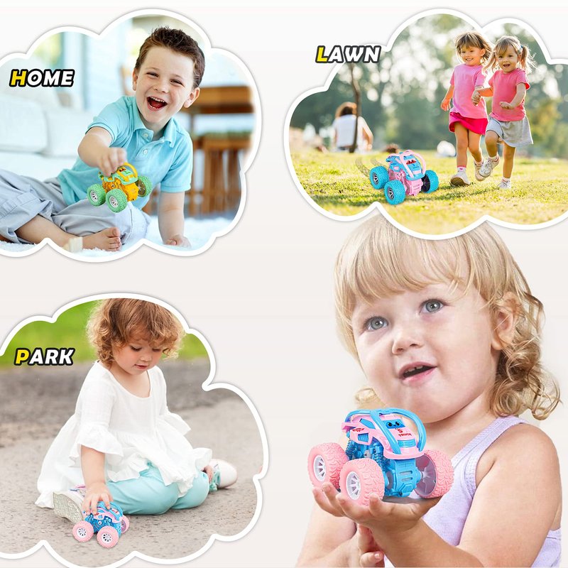 - 🚗 【Faster & farther】- Double pull back design(4×4 power), Battery free, everything is under your hands. As long as you give it strength, the stunt cars team will always serve your child. Whether in the living room, park, lawn or garden, the stunt cars team will be with your child.