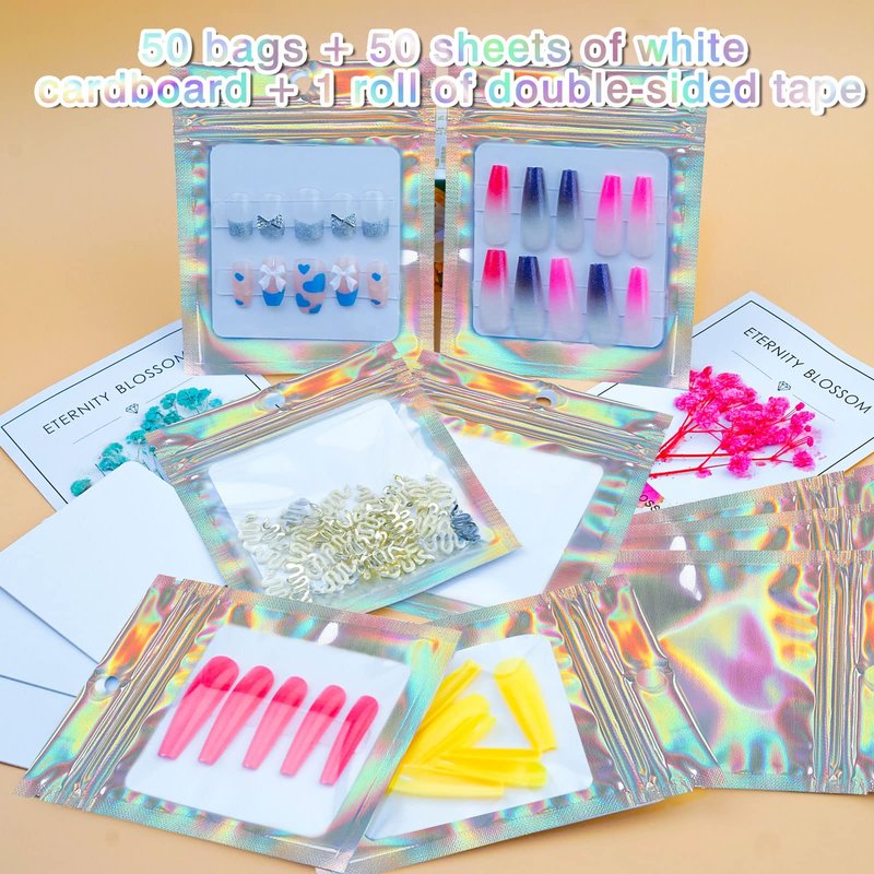 Lokyango Press on Nail Packaging Bag, 50PCS Empty Holographic Nail Storage Bag and 50PCS White Cardboard with 1 Roll Transparent Tape for Handmade Nails Business Nail Display (50pcs)