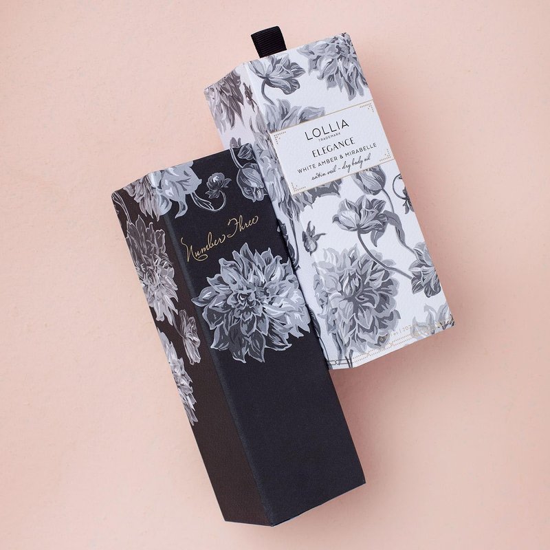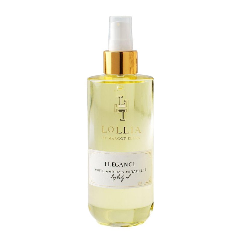 - DRY BODY OIL FOR WOMEN: Lush and gentle, Lollia Elegance Dry Body Oil is a moisture-rich pick-me-up. The body oil spray is delightfully fragranced with White Amber and Mirabelle.
