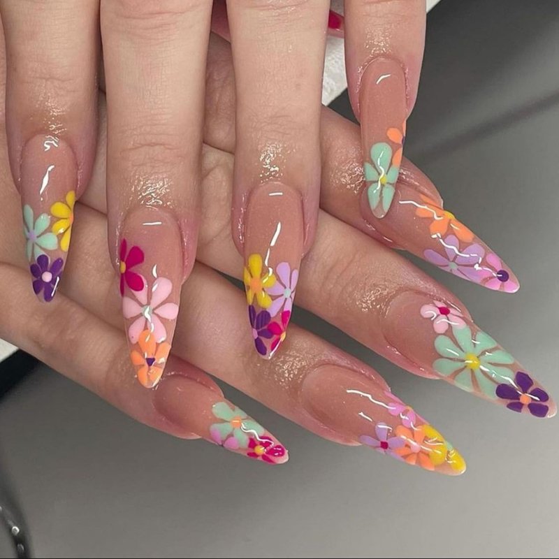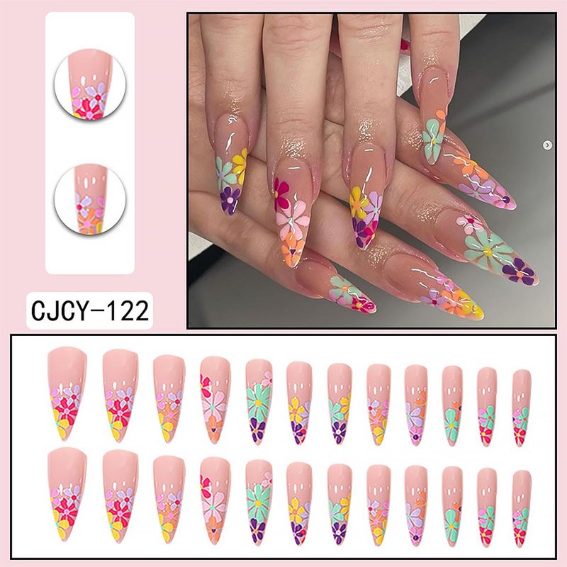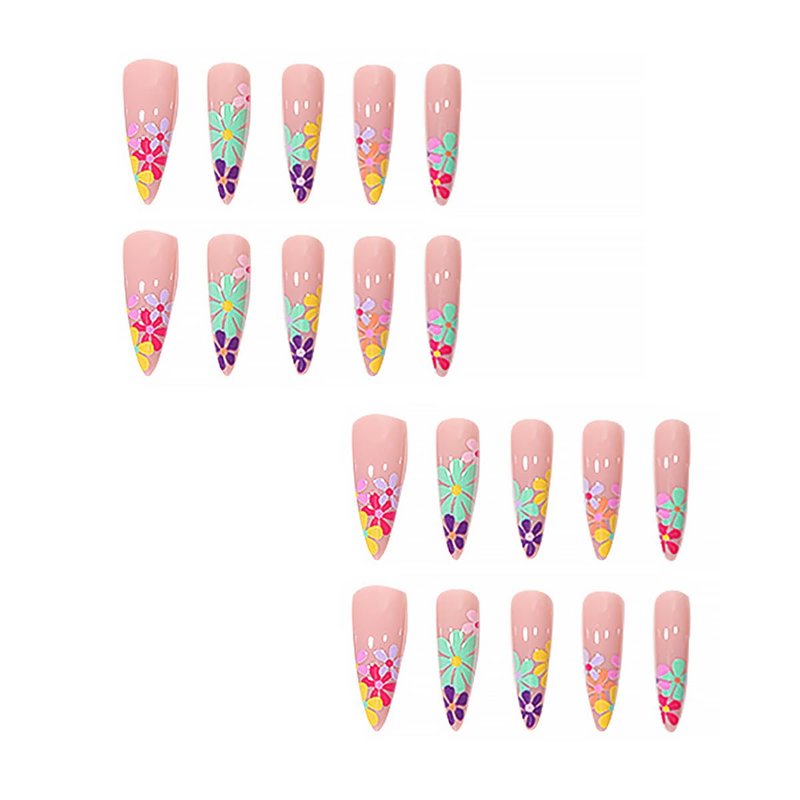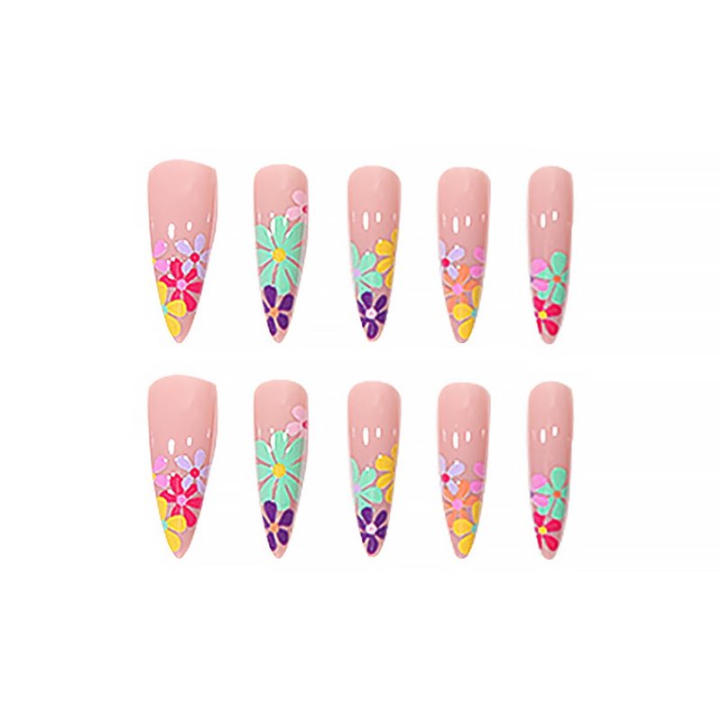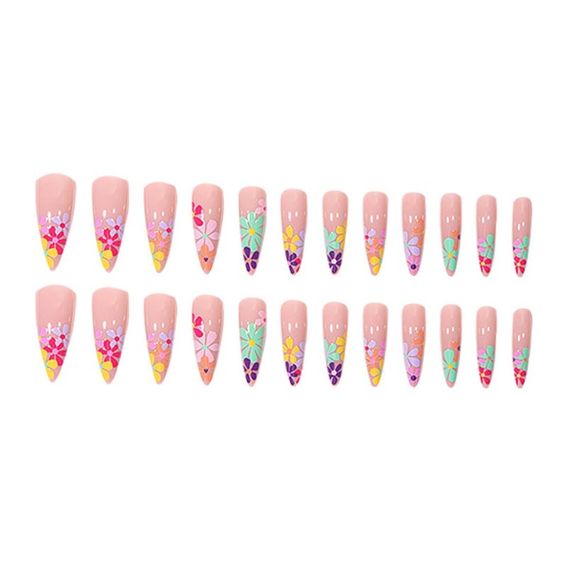 Stiletto Press on Nails Long Almond Fake Nails with Colorful Flower Design Acrylic Glue on Nails