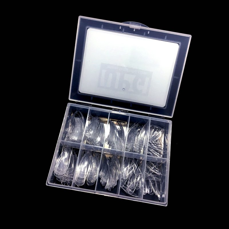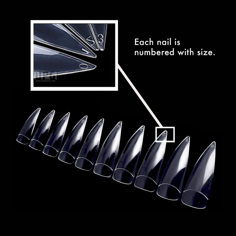 Clear stilettos are super sharp, long, and have a uniquely deep c-curve. Nail tips come in ten different sizes that are subtly pre-numbered for ease of use and arrive in a durable carrying case. Included are 200 stiletto false nails, 20 nails each size. All nails are made of 100% ABS plastic.