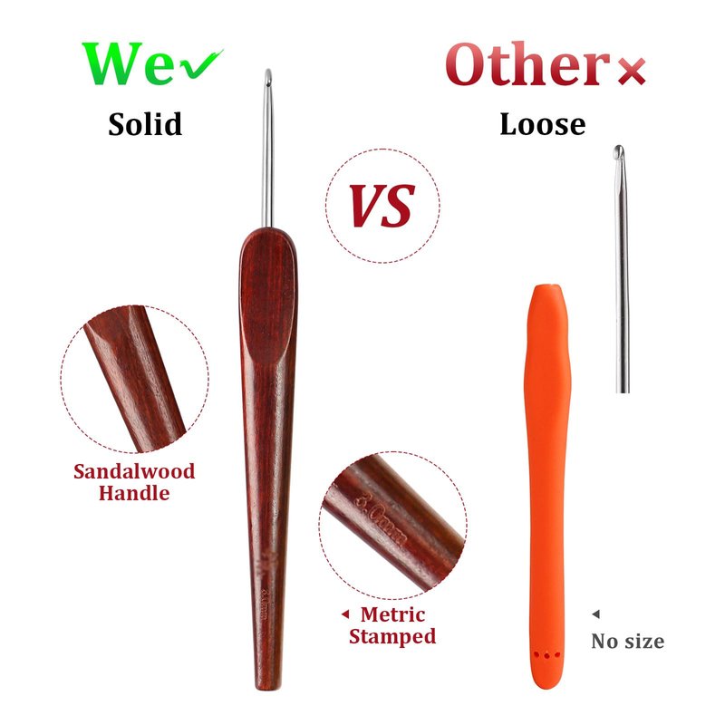 LOOEN Smooth Crochet Hooks with Mertric Numbers and 10 pcs Stitch Markers, 6 pcs Sweing Needles, 1 pc Sandalwood Crochet Hook Bag, Hand Polished Stainless Steel Crochet Hook with Wood Handle(3.0mm)