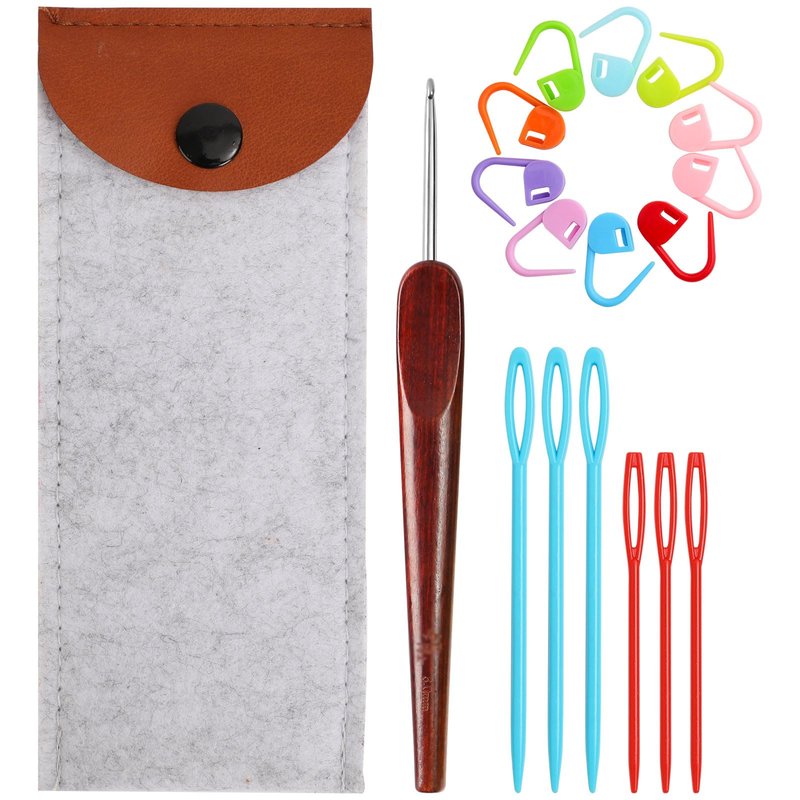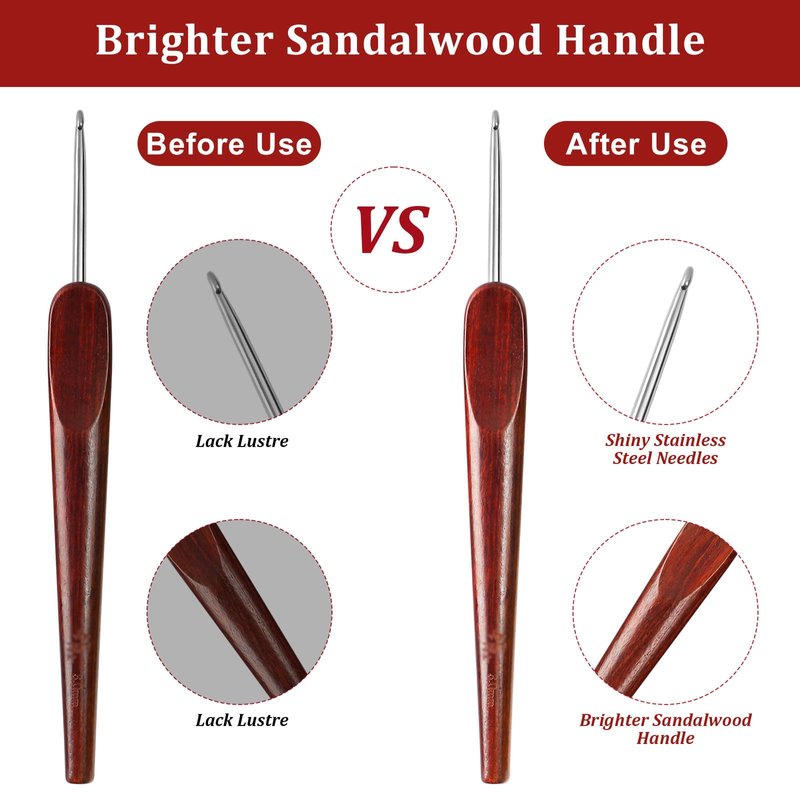 Smooth Crochet Hooks with Mertric Numbers and 10 pcs Stitch Markers, 6 pcs Sweing Needles, 1 pc Sandalwood Crochet Hook Bag, Hand Polished Stainless Steel Crochet Hook with Wood Handle