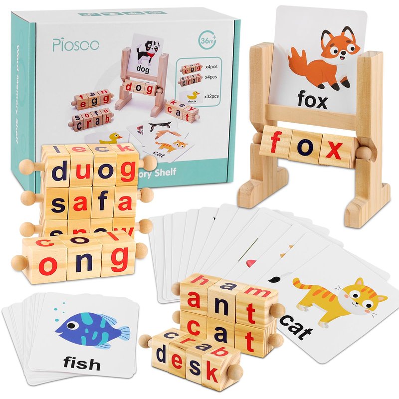 - 【Word craft ABC learning blocks】The 3-6 years old montessori reading toys includes a wooden holder, 8 handheld sets of rotating, 32pcs sight words flash cards and a storage bag. This is the perfect education toy for preschoolers' learning and play, suitable for 3 4 5 6 children's early stages of word pronunciation, developing children's memory skills, spelling skills and word recognition