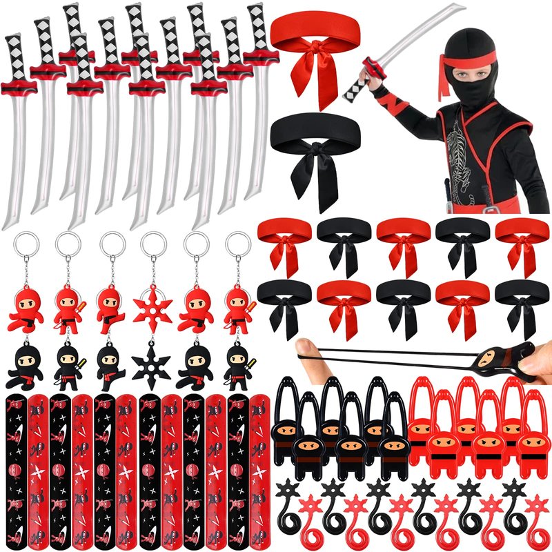 • 【72 Pcs Ninja Party Favors】---This Ninja party favors set includes 12 pcs inflatable Ninja toys+12 pcs headbands+12 pcs slap bracelets+12 pcs stretchy flying+12 pcs keychains+12 pcs stars slingshots. Let your kids enjoy a perfect Ninja party with their friends