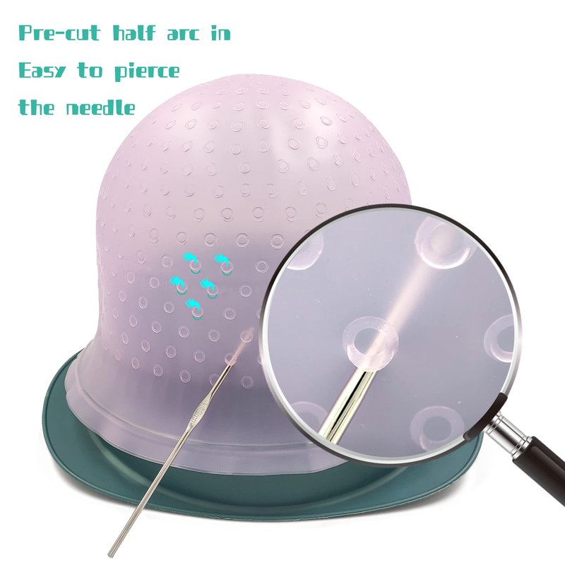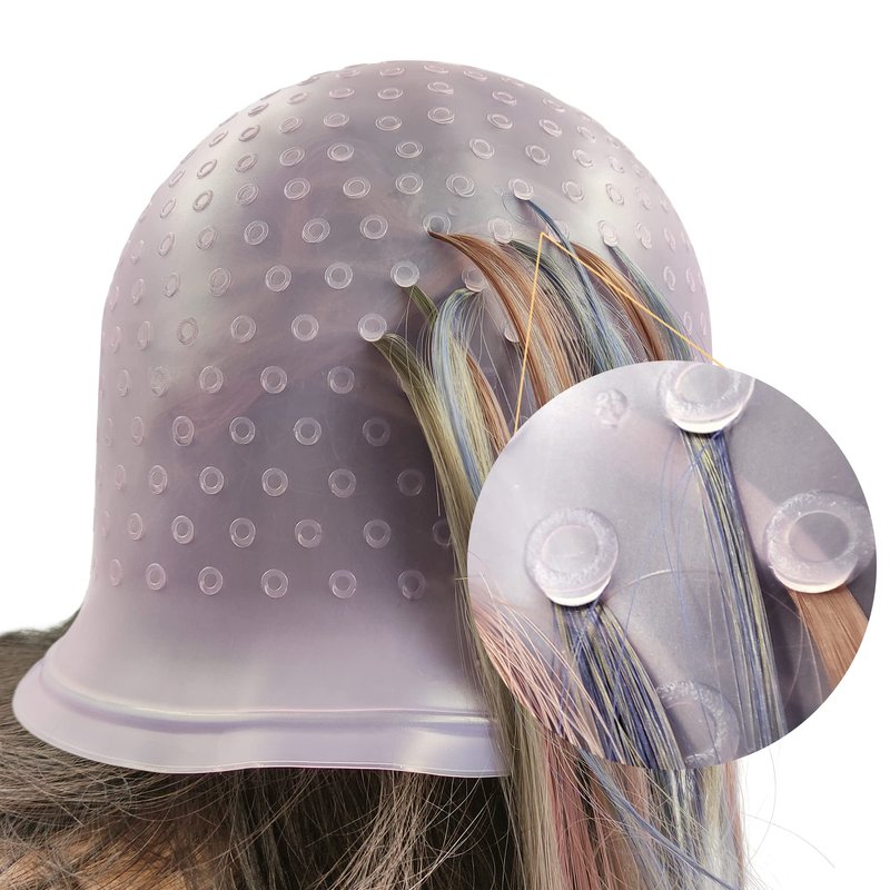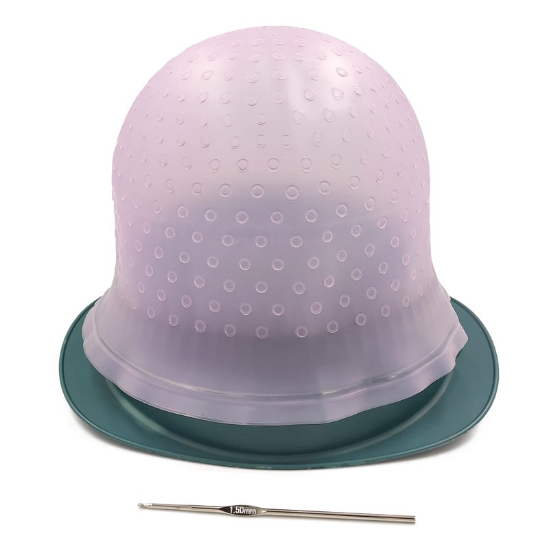 Product descriptionHighlighting Cap with Holes Open Silicone Reusable Highlighting Cap Hair Dye Cap with Holes Hair Tipping Caps Salon Hairdressing Highlight Cap Features:How to use:Step 1:Wear the hair dye cap firstly,use the metal hook needle to pick some hair puncture through the hat,then you can enjoy your hair dyeingStep 2:After waiting for some time for the hair to be dyed,gently remove the cap with both hands from the bottom of the cap edge,then rinse the hair with waterStep 3:After rinsing,you're done with hair highlights,isn't it easy? Rinse the cap,and keep it dry.You can save it for the next time you want to color your hairUsage occasions:The highlighting caps can be applied to many occasions,when you want to color your hair,you can use the dye cap,no matter you are at home or beauty salon,the high light cap can help you well,suitable for both first time users and professional hairdressersSpecifications:Color: PurpleCap material:SiliconeCap size:Circumference: approx. 56 cm/ 22 inchesHeight: approx. 17 cm/ 6.7 inchesPackage includes:1 x Tipping caps1 x Metal hookNote:There are with holes already in on the caps,please pick your hair by yourself according to your needs to do highlight dye.