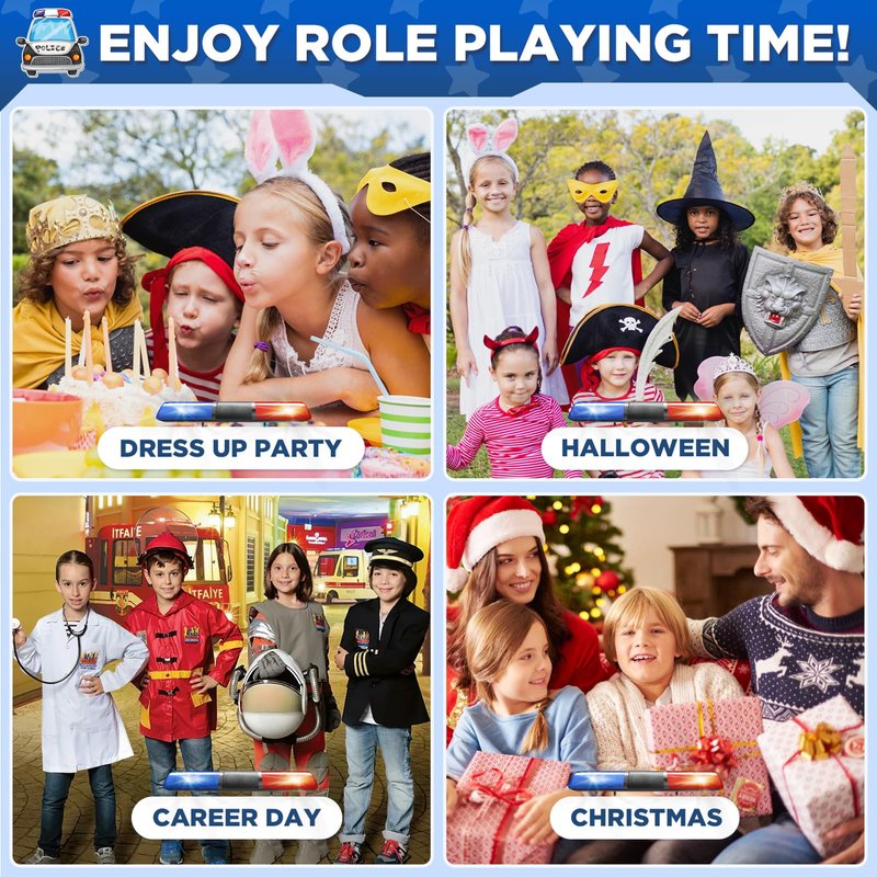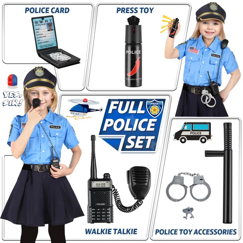 - 【Highly Detailed Police Outfit For Kids】 - To add to the fun of the Halloween costumes pretend play, the police toy within police girl costume for kids feature lifelike details that closely emulate genuine police equipment. Dressed in police uniform, kids control police toy to make real sounds, wielding walkie-talkies to repel enemies, just like genuine cops! Let your kids wear this astounding police uniform and relish boundless imaginative role-playing joy!