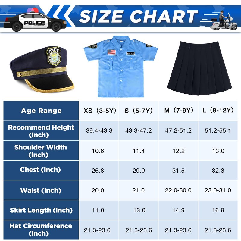 - 【Size Tips】- Toddler ( 3–5 ), Small ( 5–7 ), Medium ( 7 - 9 ) , Large( 9 - 12 ). This halloween costumes for kids is fit for 3-12 years old girls. Please select the appropriate size for your child based on their height and body size. You can refer to the size chart for guidance. A complete kids police dress-up set will allow your child to embody the role of a genuine police officer, enhancing their affection for this honorable profession. Your little princess can't wait to wear this cop uniform!