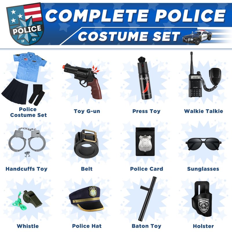 - 【Girls Police Officer Costume Set】 - Loscola police officer costume for kids set contains Police costume with skirts, Socks, Police Hat, Adjustable Belt, Walkie Talkie, Handcuffs Toy, Police Card, etc. This is a complete and luxurious girls costume set for a girl’s police career day wearing or as Halloween costumes for girls!