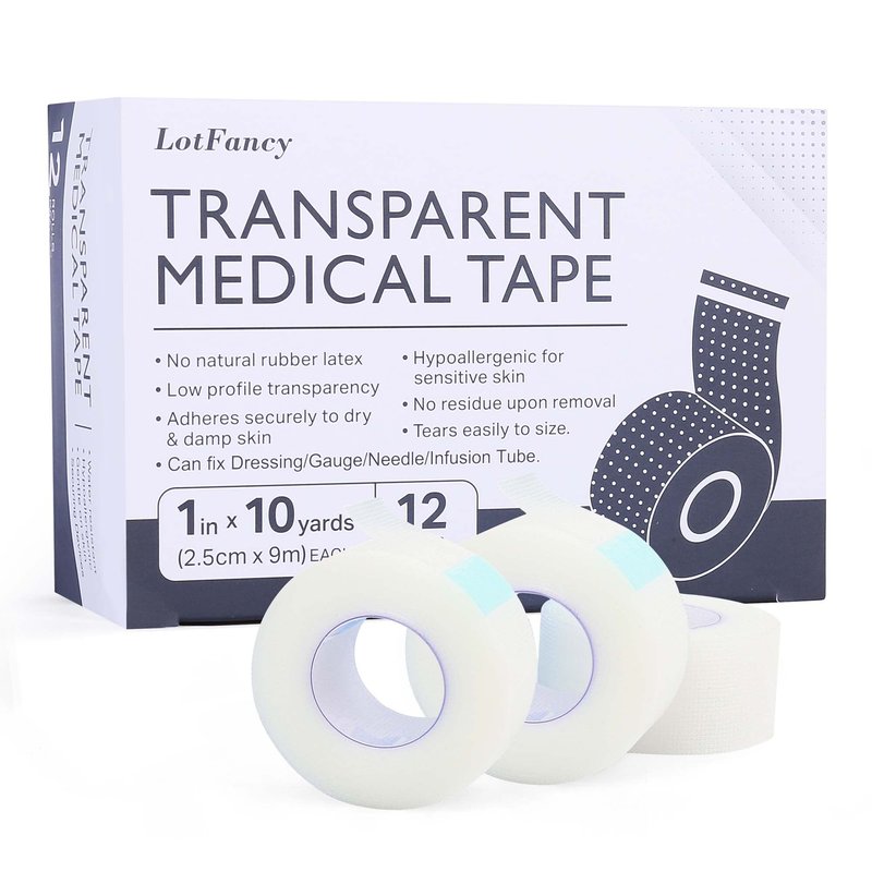LotFancy Transparent Medical Tape, 12 Rolls Adhesive Clear Hypoallergenic Surgical Tape, PE First Aid Tape for Wound, Bandage, 1inch x 10Yards, Sensitive Skin, Latex Free