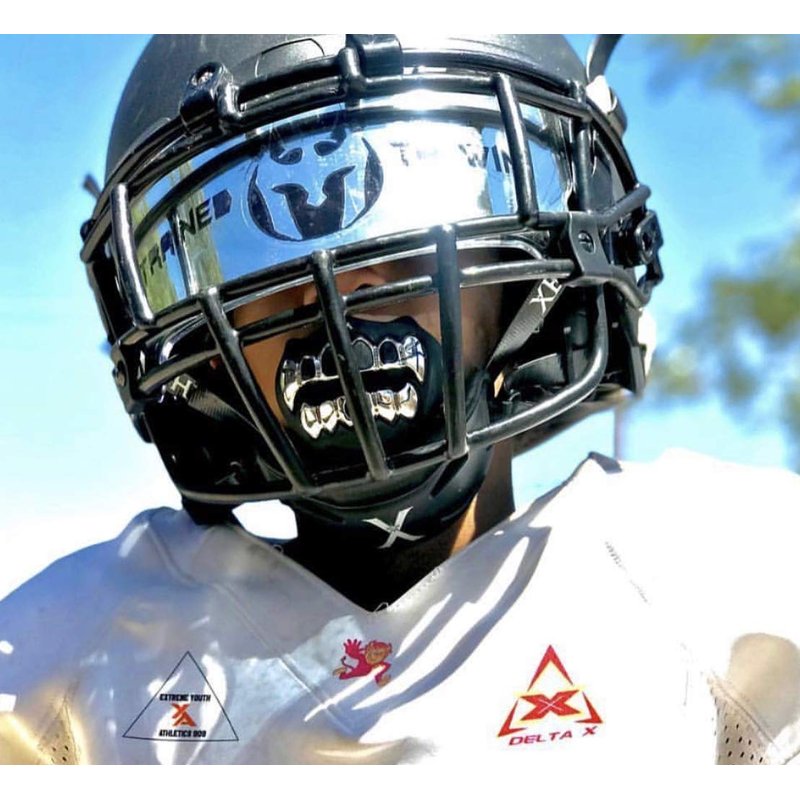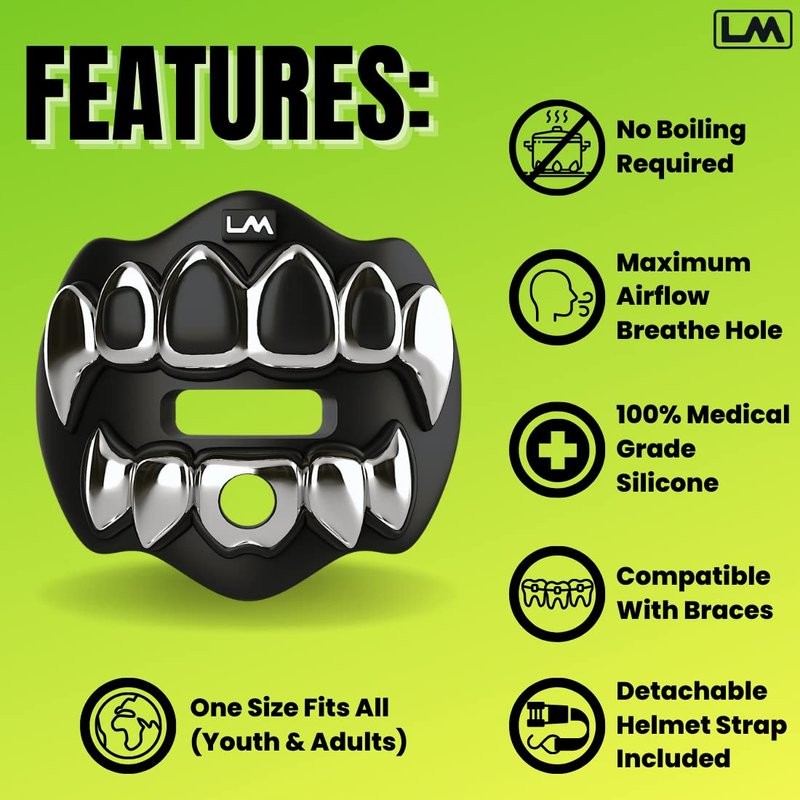 - Make a statement - Show up to game day with our 3D Bling Chrome Grillz Football Mouthguards. Designed for both youth and adults, our high-quality mouth guards offer superior protection and style. Our mouth pieces are ideal as a kids mouth guard as well as adult mouth guard, and can be worn by football players and other sports athletes. Loudmouth Mouthguards cover the mouth, teeth and gums while also maximizing airflow through the breathing hole.