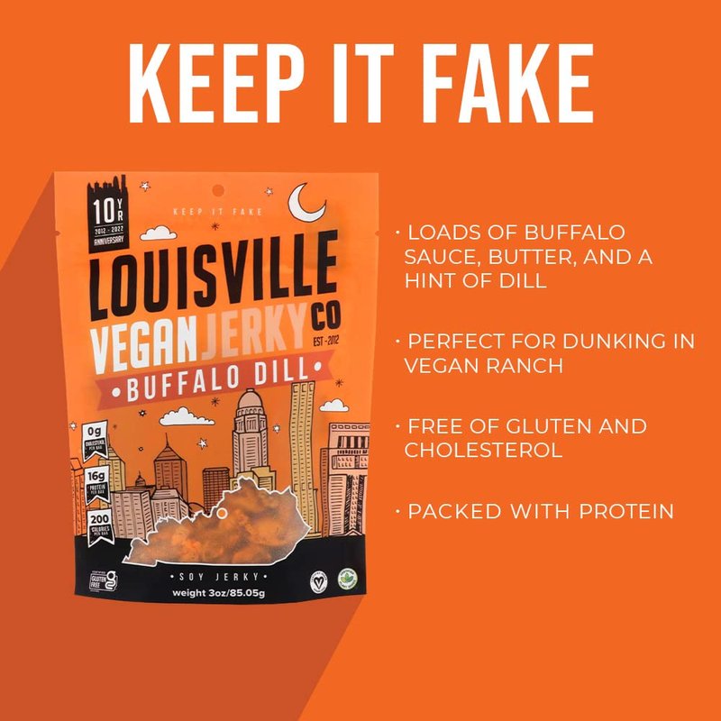 - FAKE MEAT, REAL MEATY FLAVOR: Louisville Vegan Jerky's Buffalo Dill vegan jerky is heaped with loads of buffalo sauce, butter, & a hint of dill—with hints of garlic, dill, & onion.