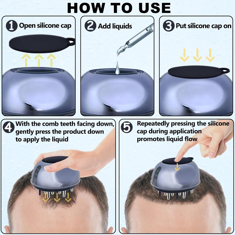 2. Scalp massage and blood circulation: The scalp serum dispenser has 14 elastic rolling ball teeth and 7 auxiliary comb teeth, which can massage your scalp and stimulate blood flow while applying the liquid. This will make you feel more comfortable and relaxed. Pressing the soft cap makes the liquid flow faster.