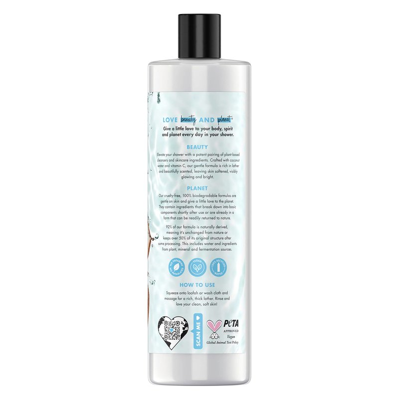 Vegan. Soften & brighten. No sulfate cleansers. 92% Naturally derived. Give a little love to your body, spirit and planet every day in your shower. Beauty: Elevate your shower with a potent pairing of plant-based cleansers and skincare ingredients. Crafted with coconut water and vitamin C, our gentle formula is rich in lather and beautifully scented, leaving skin softened, visibly glowing and bright. No parabens. No phthalates. how2recyclel.info. SmartLabel app enabled. Scan. 100% Recycled bottle. 100% Biodegradable formula. Cruelty free. Keep cap on bottle when recycling. Planet: Our cruelty-free, 100% biodegradable formulas ore gentle on skin and give a little love to the planet. They contain ingredients that break down into bask components shortly after use or are already in a form that can be readily returned to nature. 92% of our formula is naturally derived, meaning it's unchanged from nature or keeps over 50% of its original structure After sore processing. This includes water and ingredients from plant, mineral and fermentation sources. Peta approved Vegan. Global animal test policy.